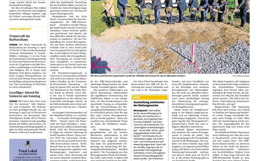 Nach langem Warten ist es endlich soweit: In Voerde beginnt in Kürze der Bau einer neuen Rettungswache. Mit dem symbolischen Spatenstich wurde nun der offizielle Start für dieses wichtige Projekt gesetzt.